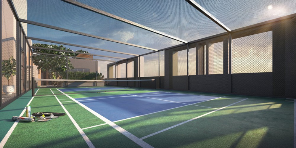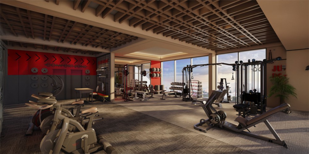 The pool area is spacious and includes clearly marked swim lanes, making it ideal for both recreational use and serious fitness training. Surrounded by floor-to-ceiling glass walls, the space is flooded with natural light, offering breathtaking views of the lush green landscape outside.